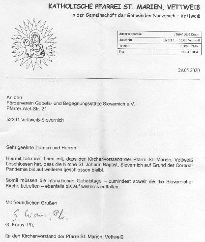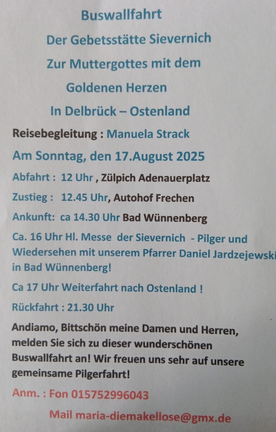 Sievernich: Gebet der Wiedergutmachung und für den Frieden, sowie Gebet zum