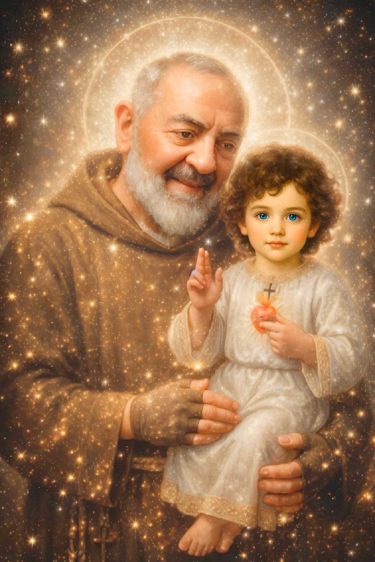 Heilige Padre Pio kommt zu uns von schönem Licht umgeben und ich begrüße ihn. Er