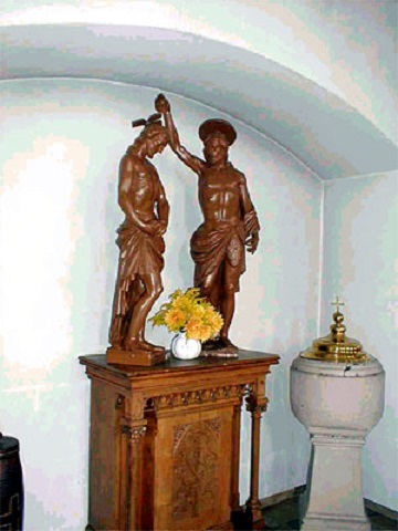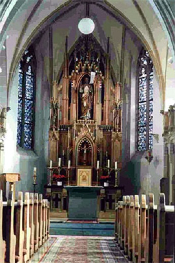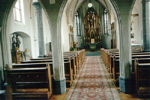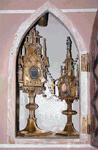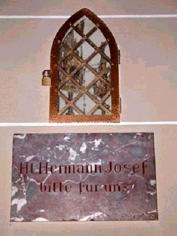 In der Reliquiennische steht links ein Reliquiar aus Messing, 40 cm hoch, mit der Reliquie vom Johannes dem Täufer, rechts ein Reliquiar aus Messing, 30 cm hoch, vom Hl. Hermann Josef von Steinfeld und in der Mitte der Rosenkranz von Pfarrer Alef.