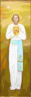 the Immaculate One on a cloud enveloped in light. Her heart opened